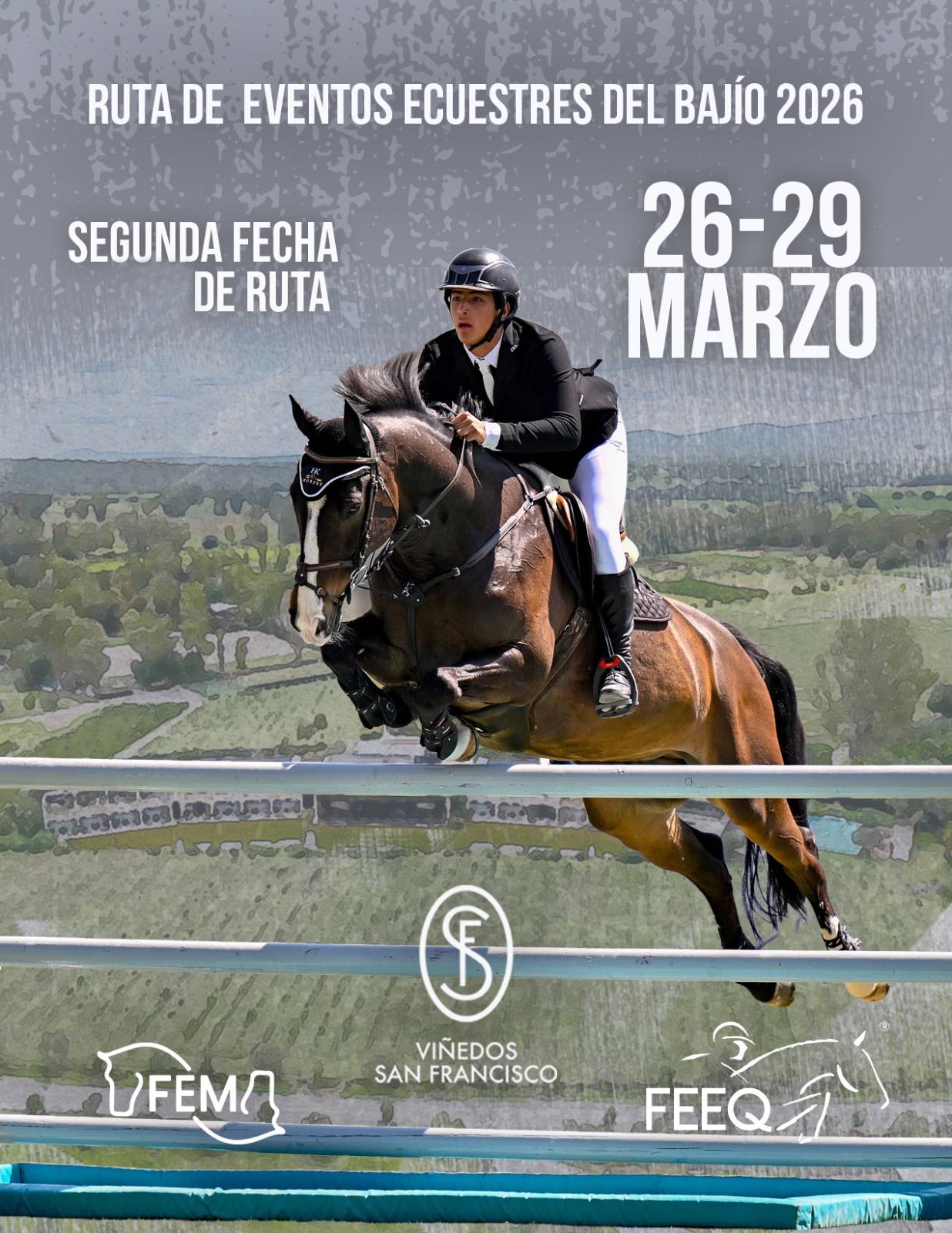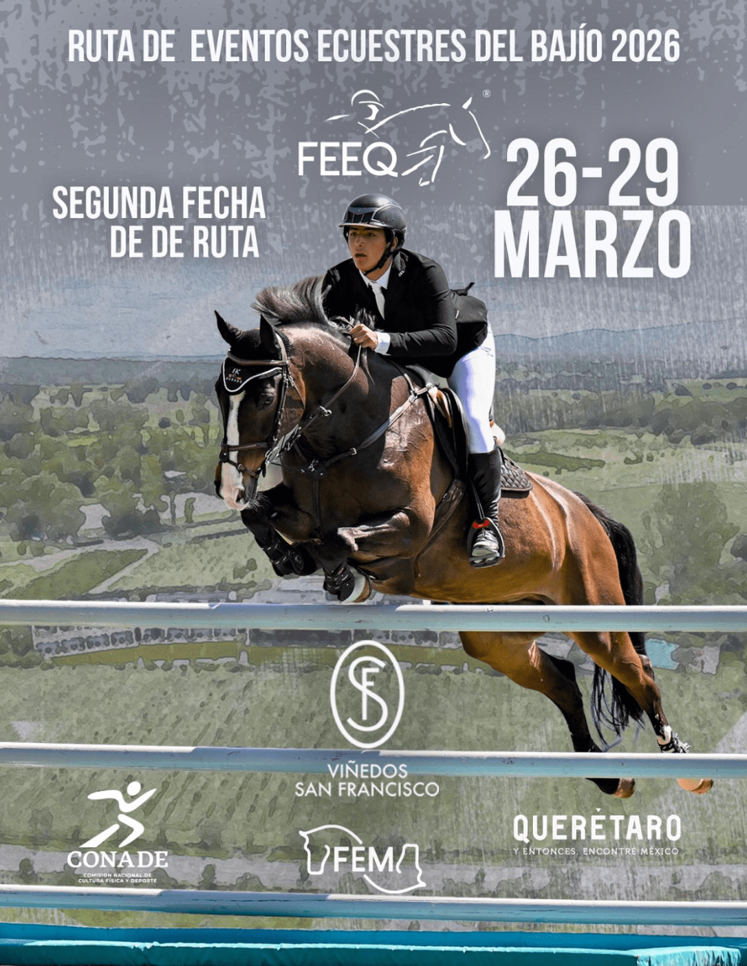 Fomento Ecuestre del Estado de Querétaro A.C. y Eventos Ecuestres Del Bajío S.A. de C.V. invitan a todos los binomios a nuestro concurso nacional de salto 2026. Que se llevará a cabo los días 26 al 29 de marzo 2026 en los Viñedos San Francisco. Carretera, Querétaro-San Miguel de Allende km 7, San Miguel de Allende, Gto.