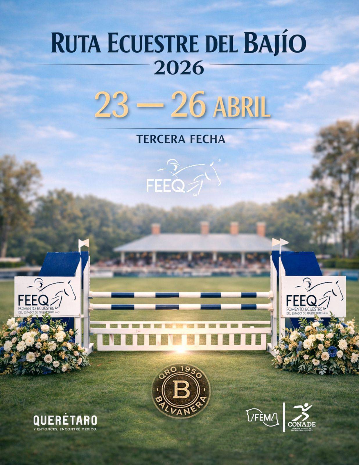 Fomento Ecuestre del Estado de Querétaro A.C. y Eventos Ecuestres Del Bajío S.A. de C.V. invitan a todos los binomios a nuestro concurso nacional de salto 2026. Que se llevará a cabo los días 23 al 26 de abril 2026 en Balvanera Polo & Country Club, ubicado en Carretera libre a Celaya Km. 10.