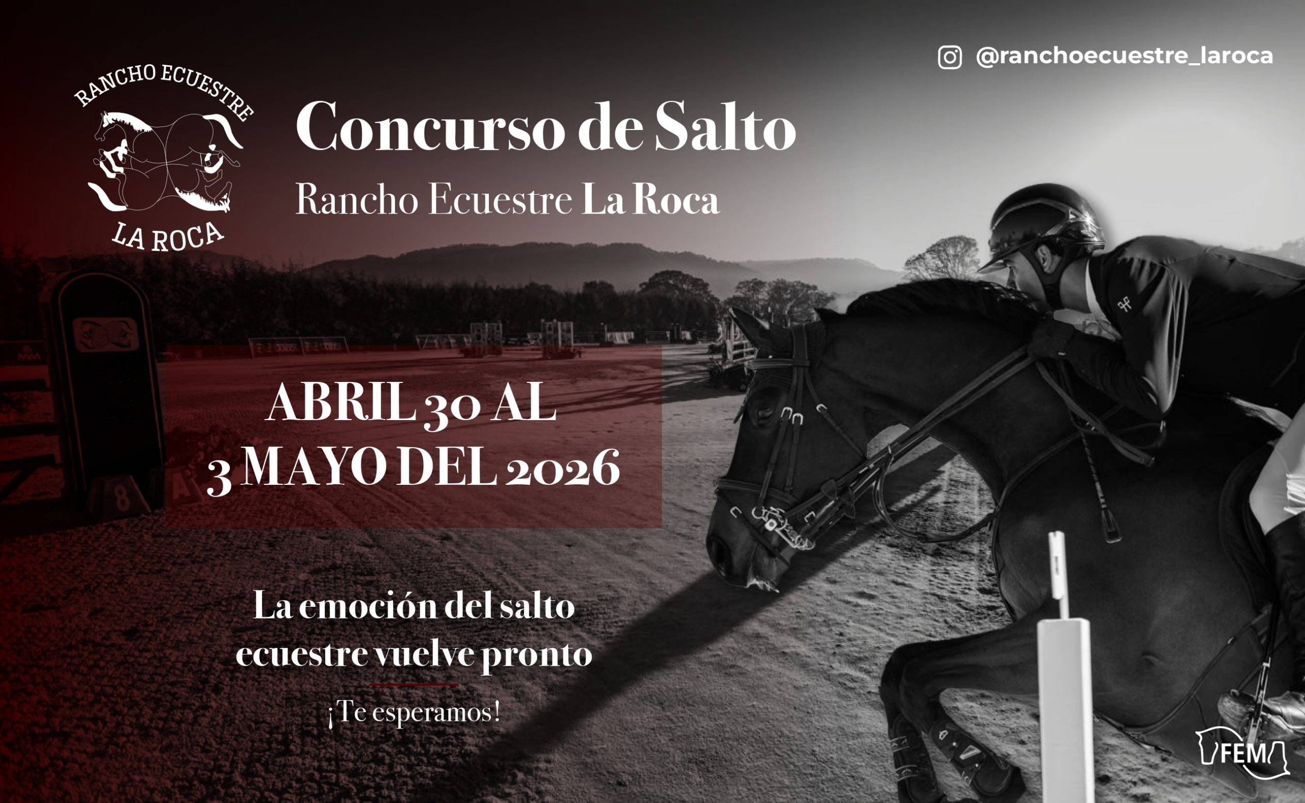 El Rancho Ecuestre La Roca, invita a todos los clubes y agrupaciones afiliadas a la Federación Ecuestre Mexicana, A.C., a participar en su 3a Fecha de Concurso de Salto Nacional RANCHO ECUESTRE LA ROCA, del 30 de abril al 3 de mayo del 2026, que se llevará a cabo en sus instalaciones ubicadas en San Miguel Ameyalco, Lerma, Estado de México
