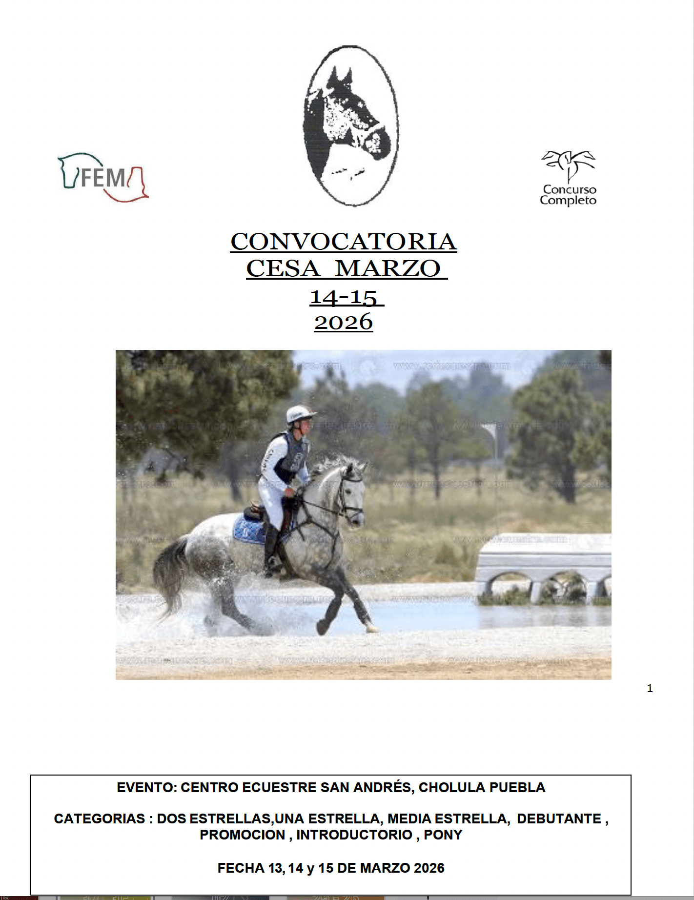 Centro Ecuestre San Andres y El comité de concurso completo de la Federación Ecuestre Mexicana invita a todos los jinetes federados a su Concurso Nacional Combinado temporada 2026, este evento se llevará acabo los días 14 y 15 de marzo en las instalaciones del Centro Ecuestre San Andres, Cholula, Puebla.